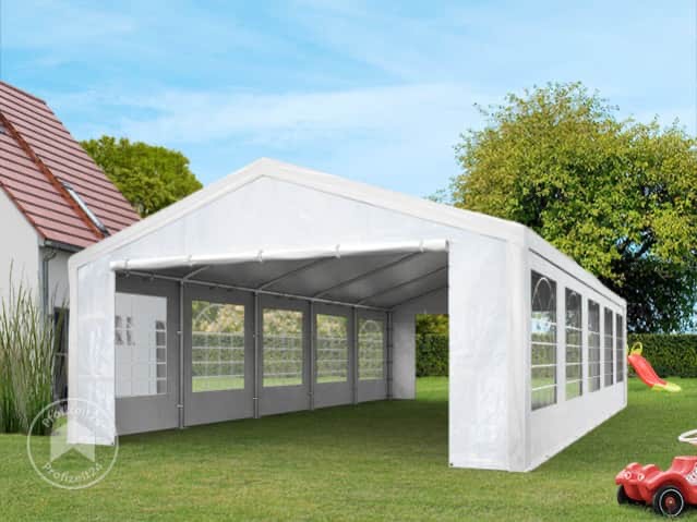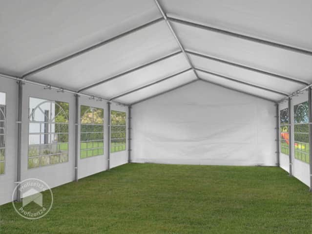 Vermiete ein Partyzelt 4x8 Meter aus PE Plane. Die durchgehende Dachplane aus einem Stück hält die Konstrukion fest zusammen und trägt zur hohen Stabilität bei. Dach macht die Dachplane ausserdem 100 % wasserdicht.